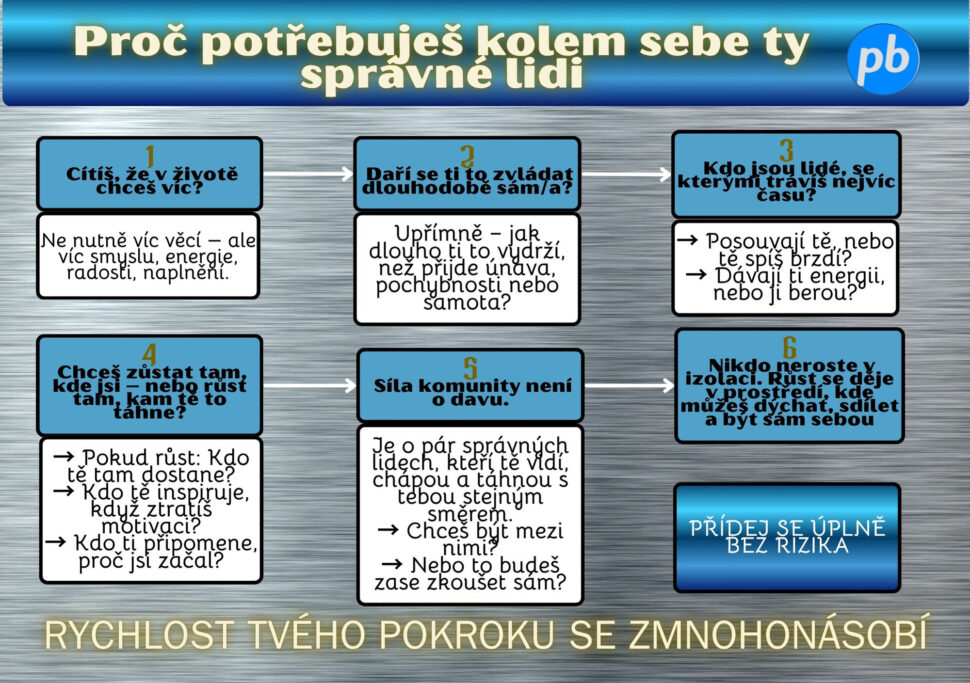 - Protože motivace přichází a odchází – ale komunita zůstáváVšichni známe ten kolotoč: nadšení, pád, restart. Když jsi součástí komunity, máš kam spadnout. A někdo Ti tam vždycky podá ruku.